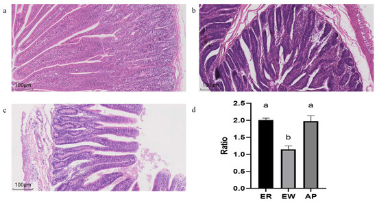 Histological changes in the jejunum of lambs. (a–c) HE-stained sections of the ER group, EW group, and AP group, respectively. (d) The V/C ratio of the ER group, EW group, and AP group. Different lowercase letters stand for significant differences (p < 0.05).