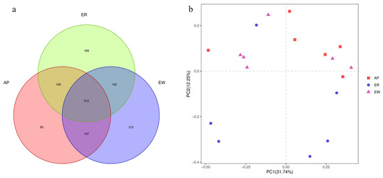The gradual stabilization of the OTU rank curve chart (Supplementary Figure S1) suggests that the test samples had good coverage. In total, 1,307,195 high-quality reads were obtained, with an average of 72,622 reads per sample, and the sequence lengths ranged from approximately 380 to 440 bp. Sequence coverage was considered sufficient, as indicated by the Good’s coverage (>0.98) for all samples. Based on 97% nucleotide sequence identification, we identified a total of 1,294 OTUs, with an average of 331 ± 98 OTUs per sample. Specifically, the ER group had 892 OTUs, the EW group had 933 OTUs, and the AP group had 811 OTUs (Figure 2a). Among these, 512 OTUs (39.57% of the total) were shared among samples from different groups. Notably, 614 OTUs (47.45%) were shared between the ER group and EW group, 614 OTUs (47.99%) were common between the ER group and AP group, and 619 OTUs (47.84%) were shared between the EW group and AP group. These findings indicate differences in OTU composition among the different groups.