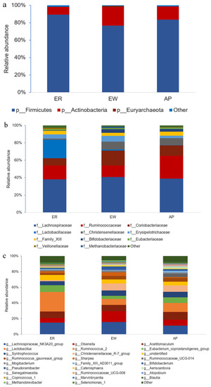Compositional profiles of intestinal microbiota from lambs among the three groups. (a) Phylum level, (b) family level, and (c) genus level. ER, ewe-reared group; EW, early weaning group; AP, antimicrobial-peptide-fed group.