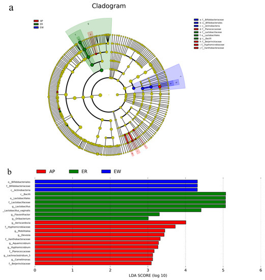 To better understand the dominance of specific bacteria within the three groups, we used the LEfSe method (Figure 4). Lactobacillaceae, Lactobacillales, and Bacilli were enriched in the ER group. Bifidobacteriaceae, Bifidobacteriales, and Actinobacteria were overrepresented in the EW group. Planococcaceae, Beijerinckiaceae, Hyphomicrobiaceae, and Xanthobacteraceae were abundant in the AP group.