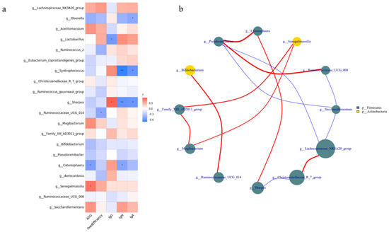 Correlation analysis of intestinal microbiota from lambs among the three groups. (a) Correlation between the top 20 relative abundances of genera, growth performance, and serum immune indicators. (b) Interaction among the top 20 relative abundances at the genus level. Red represents a positive correlation and blue a negative correlation. The number represents the correlation coefficient. * represents p < 0.05, ** represents p < 0.01. The size and color of the circle represent the relative abundance of the respective genus and the phylum.