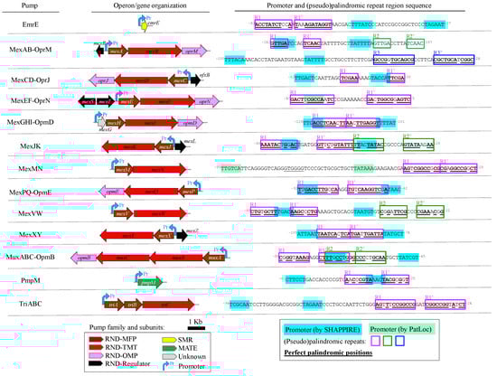 Next, potential operators consisting of perfect or pseudo-palindromic repeats close to promoter sequences for the expression of these pumps were mapped onto the genome of the PAO1 reference strain. For that, sequences corresponding to the intergenic regions were inspected considering the genetic structure of their transcriptional units, either single genes or operons (Figure 1). Promoters were either experimentally reported [] or predicted for all cases. A total of 18, ranging from one to three, (pseudo)palindromic repeats overlapping or in the vicinity of promoter boxes, at 20 nt or less, were identified for all pump transcriptional units (Figure 1). These motifs where 9.3 ± 2.3 nt (mean ± standard deviation) in length with 1.6 ± 0.7 non-palindromic positions, inter-repeat spacers of 3.5 ± 2.8 nt and distances of 2.8 ± 5.6 nt to the closest promoter box. None of these repeats were predicted as part of transcriptional terminators of flanking genes. Only palindromes for MexAB-OprM were previously reported as operators, e.g., GTTGA in mexA [], and included in gene regulation resources, such as PRODORIC [] or RegTransBase []. Altogether, a diverse set of (pseudo)palindromic repeats that likely act as potential operators in P. aeruginosa MDR pump genes were detected.