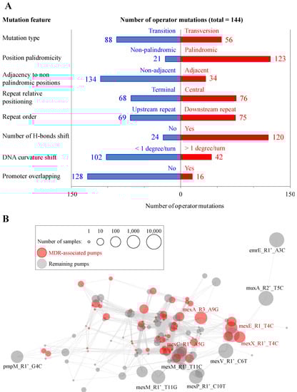Operator mutation property correlations and mutation groups. (A) Occurrence for binary properties of operator mutations. (B) Organization of the mutational space in upstream repeats of P. aeruginosa efflux pumps. Nodes correspond to independent mutations. Edges (in light gray) correspond to links between mutations sharing exact values for seven, i.e., all but one for those considered, between mutation pairs. Nodes from the four principal pumps (see Introduction) are in red while the remaining ones are in gray, and labeled when involved ≥50 and ≥500 samples, respectively. The sphere size is proportional to the number of samples carrying the mutation.