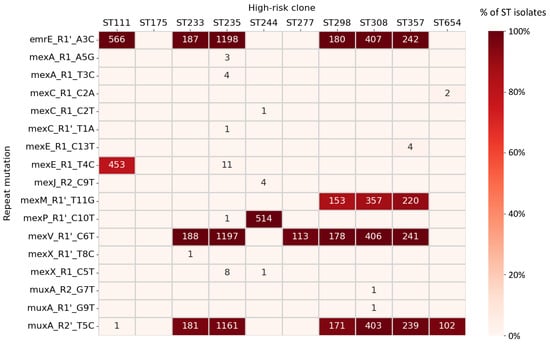 Other central mutations were linked to non-high-risk STs in a (near) exclusive way, suggestive of potential clinical emergence. For instance, the mexX_R1_C7T polymorphism was mostly associated with ST508 isolates, which caused a recent outbreak in China []. Other changes involved repeat central positions and associated with STs rarely found in clinical surveys. Examples for these were mexG_R1_C5A in ST1248, mexM_R1′_A3G in ST701 and pmpM_R1′_G4A in ST3218 (Supplementary Table S4).