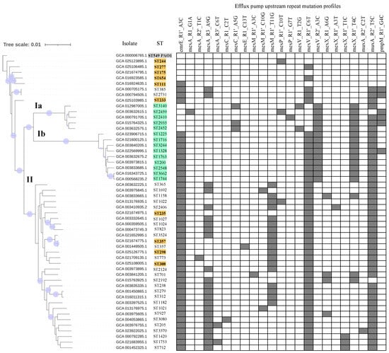 The phylogenomic tree revealed two salient clades (Figure 5). In addition, a series of strains with two-to-none mutations, including PAO1 and five high risk-clones, located close to the root. One of the clades, termed clade I (in orange in Figure 5), was further subdivided into two sub-branches (clades Ia: 5 isolates, and Ib: 8 isolates). As a hallmark, the whole clade I contained mexV_R2’_A3C in exclusivity and was also associated almost perfectly with the presence of mexX_R1’_T4C. Furthermore, the subclade Ia harbored mexC_R1’_A5G (three isolates) and pmpM_R1’_G4C (three isolates) but no isolates in this subclade showed the common emrE_R1’_A3C change. Both subclades of clade I typically include single, double and triple locus variants of MLST alleles. The clade II included 26 isolates plus four high-risk clone representatives (ST235, ST298, ST308 and ST357). This clade was enriched in isolates carrying the mexA_R3_A9G and mexM_R1’_T11G changes, which are fully absent in clade I. In addition, some mutations were ST-specific. For instance, mexP_R1′_G7T was only found in ST2410 (clade Ia) while mexA_R2’_T11C and mexM_R1’_A3C were detected in ST773 and ST701 (both in clade II), respectively.