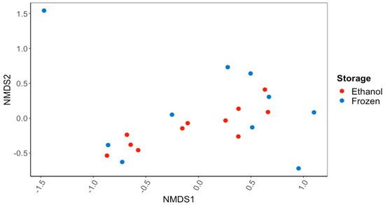 NMDS ordination based on Bray–Curtis dissimilarity scores for gut bacterial communities of the Asian Clam, Corbicula fluminea, preserved in 95% ethanol or frozen at −20 °C for 60 d. There was no significant difference (PERMANOVA; p > 0.05) in the bacterial communities recovered after the different sample preservation methods.