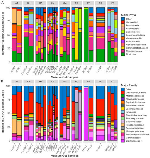 Major bacterial phyla (A) and families (B) detected in the guts of long-term stored freshwater mussels, as determined from percent of 16S rRNA gene sequences recovered. Each bar represents one individual, and bars are separated by mussel species (species abbreviations AT = Alasmidonta triangulata (n = 2), HA = Hamiota altilis (n = 4), LV = Lampsilis virescens (n = 6), MM = Margaritifera marrianae (n = 3), PC = Pseudodontoideus connasaugaensis (n = 3), PF = Ptychobranchus foremanianus (n = 2), TC = Theliderma cylindrica (n = 1), CN = Cambarunio nebulosus (n = 2), and VT = Venustaconcha trabalis (n = 3)). The mussels were propagated in captivity from parents of wild origin. the sample names relate to the mussel species (e.g., At = Alasmidonta triangulata), the last two digits of preservation year (e.g., 2019 = 19), the river of parental origin (e.g., F = Flint, SH = Shoal Creek), and the sample number within the group.