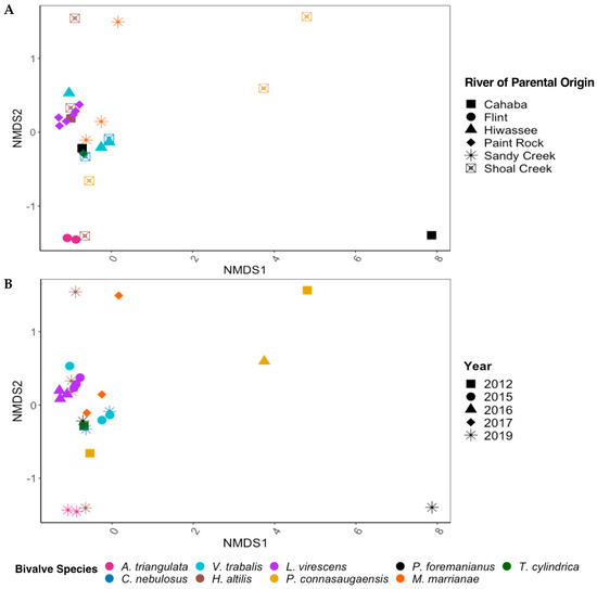 NMDS ordinations based on Bray–Curtis dissimilarity scores for the gut bacterial communities of nine species of freshwater mussels (Alasmidonta triangulata, Cambarunio nebulosus, Venustaconcha trabalis, Hamiota altilis, Lampsilis virescens, Pseudodontoideus connasaugaensis, Ptychobranchus foremanianus, Margaritifera marrianae, and Theliderma cylindrica) preserved in ethanol for 2–9 years. The mussels were propagated in captivity from wild parents, and ordinations are shown based on the river of parental origin (A) and the year of sample preservation (B). The gut communities were analyzed in 2021, reflecting storage durations of 2 years (2019 samples), 4 years (2017), 5 years (2016), 6 years (2015), and 9 years (2012). There were significant differences between the gut microbial communities based on mussel species (PERMANOVA; p < 0.01, F = 1.816) but not between the rivers of parental origin and storage duration (p > 0.05) within the full statistical model.