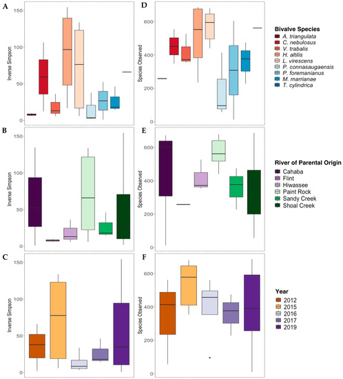 Alpha diversity metrics (Inverse Simpson’s Index, (A–C); Species Observed, (D–F)) derived from the gut bacterial communities of nine species of long-term-stored freshwater mussels. The mussels were propagated in captivity, and samples are grouped based on the mussel species ((A,D); Alasmidonta triangulata n = 1, Cambarunio nebulosus n = 2, Venustaconcha trabalis n = 3, Hamiota altilis n = 4, Lampsilis virescens n = 6, Pseudodontoideus connasaugaensis n = 3, Ptychobranchus foremanianus n = 2, Margaritifera marrianae n = 3, and Theliderma cylindrica n = 1), river of parental origin ((B,E); Cahaba River n = 3, Flint River n = 2, Hiwassee River n = 3, Paint Rock River n = 6, Sandy Creek n = 3, and Shoal Creek n = 7), and preservation year ((C,F); 2012 n = 3, 2015 n = 5, 2016 n = 4, 2017 n = 4, and 2019 n = 10). Boxes show the interquartile ranges/distributions of values measured in each metric, with the black solid line representing the median value from the sample type. Vertical lines represent the highest and lowest values associated with each grouping variable. Dots represent outliers from each group. There were no significant differences in the Inverse Simpson’s index values or Species Observed within species, the river of parental origin, or storage duration (p > 0.005).