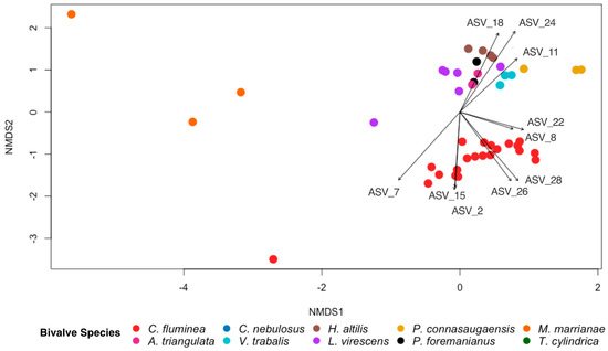 NMDS ordination based on Bray–Curtis dissimilarity scores for gut bacterial communities of the invasive Asian clam, Corbicula fluminea, and nine species of native North American freshwater mussels (Alasmidonta triangulata, Cambarunio nebulosus, Venustaconcha trabalis, Hamiota altilis, Lampsilis virescens, Pseudodontoideus connasaugaensis, Ptychobranchus foremanianus, Margaritifera marrianae, and Theliderma cylindrica). Ordinations are shown based on bivalve species. The ten most abundant ASVs comprising >1% of all ASVs from each sample are indicated with vector arrows for which the arrow length and direction are proportionate to their effect size and association to the samples, respectively. The gut bacterial community of C. fluminea was significantly different from that of the native mussel species (PERMANOVA; p < 0.001, F = 11.378).
