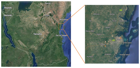 Schematic representation of sampling areas in Tanzania. Water sources from Tanga city and the nearby village Pongwe (orange dots) were collected, according to the defined geographical locations (Table 1).