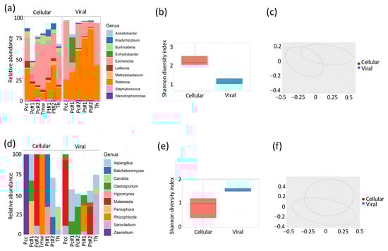 To mitigate the risk of infectious disease outbreaks and the spread of AMR through the environment, it is crucial to better understand local patterns and dynamics of microbial communities and AMR. To investigate the microbial composition in water samples from Tanzania during a cholera outbreak, we collected water from both taps and wells in different locations, both adjacent to and geographically far away from the site of the outbreak. Microbial components in the water were separated into cellular and viral fractions, after which DNA was extracted, and 16S and 18S amplicon sequencing was performed (Figure 2). Both the alpha (Shanon diversity index; 2b) and beta diversity (PcoA; 2c) differ significantly (p < 0.05) between the cellular (e.g., bacteria or fungi) and viral (e.g., bacteriophage) fractions. The relative abundance of bacteria and fungi within the cellular and viral fraction can be seen in Figure 2a,d, respectively. For bacteria, in particular, the genera Bradyrhizobium, Burkholderia, Escherichia, Leifsonia, and Ralstonia (ENA accession number: PRJEB58100; see Supplementary Table S1 for all accession numbers) were statistically different (p < 0.01). For fungi, only the genus Cladosporium was significantly different (p < 0.05) between the two compartments.