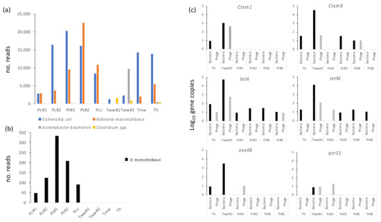 - Quirós, P.; Colomer-Lluch, M.; Martínez-Castillo, A.; Miró, E.; Argente, M.; Jofre, J.; Navarro, F.; Muniesa, M. Antibiotic Resistance Genes in the Bacteriophage DNA Fraction of Human Fecal Samples. Antimicrob. Agents Chemother. 2014, 58, 606–609. [Google Scholar] [CrossRef] [PubMed]