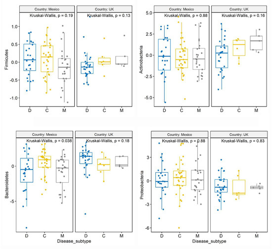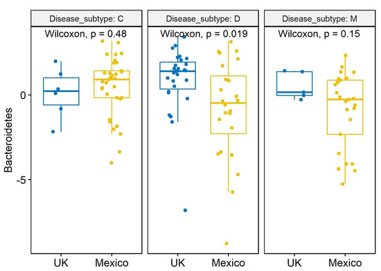 Similar to the analysis of relative abundance, the analysis of clr-transformed data using the K-W test on all samples (n = 120) also showed no differences in the abundance of the main phyla among IBS subtypes, with the exception of a trend for lower Bacteroidetes in IBS-M compared with the other IBS subtypes (p = 0.08). There was also no difference between genders, but the U.K. samples had more Bacteroidetes (p = 0.01 K-W test, p = 0.02 with PROC MIXED) and less Proteobacteria (p = 0.004 K-W test, p = 0.008 with PROC MIXED) compared with the Mexican samples. Interestingly, separate analysis of patients from Mexico (n = 82) showed a significant difference in Bacteroidetes among IBS subtypes (p = 0.04 using both K-W test and PROC MIXED, Figure 1), with a higher abundance in IBS-C compared with both IBS-D and IBS-M (p = 0.03). The pattern of variation (Table 2) and the higher abundance of Bacteroidetes in patients from Mexico with IBS-C was not revealed in the analysis of relative proportions described above (p = 0.158 in the K-W test). Separate analysis of samples from females (n = 94) showed no difference in any phyla among IBS subtypes. Age and BMI as continuous explanatory variables were not significantly related to the variation in the clr-transformed data for all main phyla using all samples or Mexican samples only (Supplementary Materials).