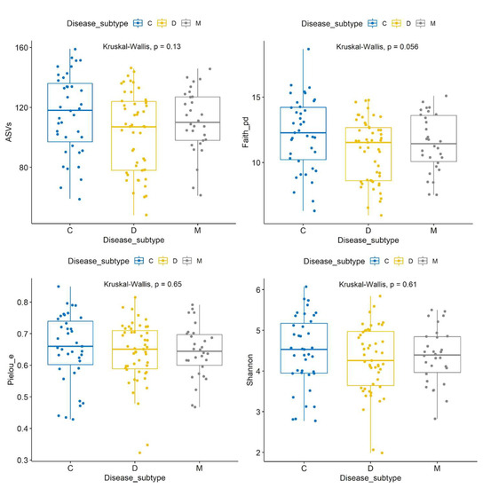The visualizer alpha-group-significance within the diversity plugin in QIIME2 was used to compare alpha diversity metrics with 29,000 sequences per sample. Using all samples (n = 120), there was no significant difference in the Shannon index (p = 0.61), evenness (p = 0.65), ASVs (p = 0.13), or the Chao1 index (p = 0.14) among the IBS subtypes, and a non-significant difference was recorded in Faith’s PD (p = 0.056 all groups, IBS-C > IBS-D with p = 0.02) (Figure 3). A Venn diagram also showed only a few ASVs that were unique to each subtype.