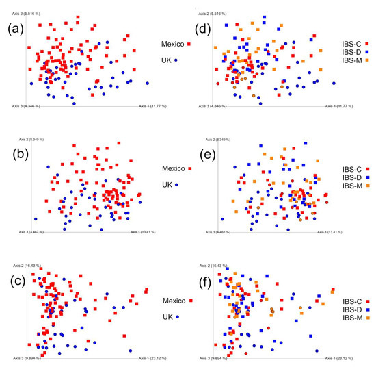 PCoA plots with Jaccard (a,d), unweighted (b,e), and weighted (c,f) UniFrac distances. The plots were separated to show samples according to country (a–c) and IBS subtypes (d–f). In all cases, samples from Mexico are squares and those from the U.K. are circles.