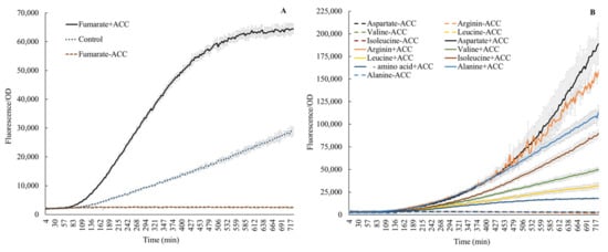 Effect on acdS promoter activity by fumarate (A) and amino acids (B), with or without ACC. Control (A): without fumarate, but with ACC.
