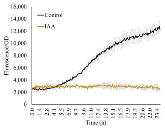 IAA (1500 ppm) in the presence of ACC (100 ppm) inhibits expression from the acdS promoter. Control: 100 ppm ACC without IAA.