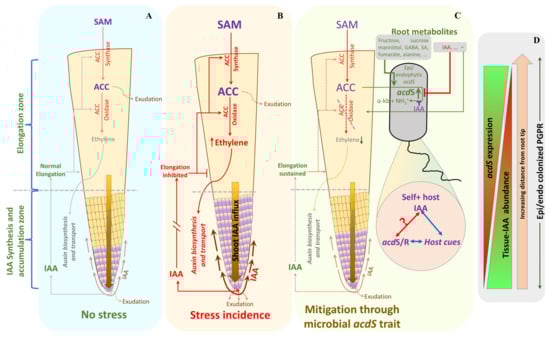 The results presented here led us to propose the following hypothesis for the interactions between P. hormoni G20-18T and wheat roots (Figure 7). In the root under normal growth conditions without abiotic stress, Figure 7A, there exists an intricate balance between ethylene and IAA biosynthesis and subsequent localization of IAA to the elongation zone. During stress (Figure 7B), induction of ethylene leads to ethylene-responsive cascades that induce auxin transport proteins and induce localization of IAA within the root elongation zone, causing ethylene-induced inhibition of root elongation. However, in stressed plant roots growing in the presence of P. hormoni G20-18T (Figure 7C), ACC produced by the plant will be channeled into the ACC deaminase-producing bacterial cells where ACC is converted to ammonia and α-ketobutyrate. Furthermore, root exudate molecules such as sugars (e.g., fructose, glucose, and mannitol) and amino acids (e.g., aspartate, alanine, and arginine) may further stimulate this conversion of ACC, and in the endophytic compartment, fumarate may further induce synthesis of ACC deaminase. Thus, the lower ACC concentration will result in lower ethylene-induced inhibition of root elongation. However, this will only work if ACC deaminase-producing bacteria are present on or in the root before the onset of the abiotic stress. If the bacteria associate with stressed plant roots, it is likely that the high IAA concentrations might induce an inhibitory influence on the production of ACC deaminase and no bacterium-induced lowering of the ethylene concentration will occur (Figure 7D). Overall, the plant IAA could exhibit a higher influence due to its ethylene-dependent specific localization in the roots that determines root growth and development. Although a general concentration of IAA ranges on the order of 250 pM g−1 of wheat roots on a fresh weight basis [], the localization could be highly site-specific along the roots and might lead to the development of IAA-rich zones. Moreover, under a natural scenario, an association of high-IAA-producing microbes could further augment the local IAA concentration at the site of root colonization; thus, the phenomenon depicted in Figure 7C may occur along the root regions with IAA hyperactivity. Further, within the rhizosphere and endophytic habitat, acdS expression occurs in the presence of a complex mixture of biomolecules that could influence acdS activity in either a positive or negative manner. Therefore, net acdS activity under such a highly complex chemical scenario still remains unknown.