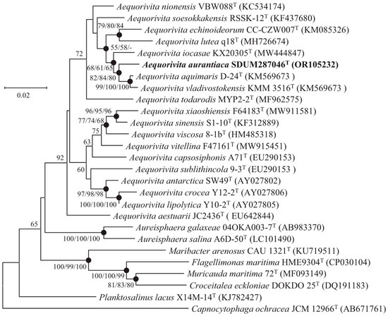 The ANI and dDDH values between strain SDUM287046T and A. aquimaris D-24T (A. antarctica DSM 14231T) were 77.6% (78.3%) and 20.8% (21.5%), respectively, which were lower than the species delineation thresholds of 95–96% for ANI and 70% for dDDH [47,48]. The protein phylogenetic tree, showing the evolutionary relationships of strain SDUM287046T and some related type strains, indicated the strain was affiliated with the genus Aequorivita (Figure 2), which was consistent with the result of 16S rRNA gene phylogenetic analysis.