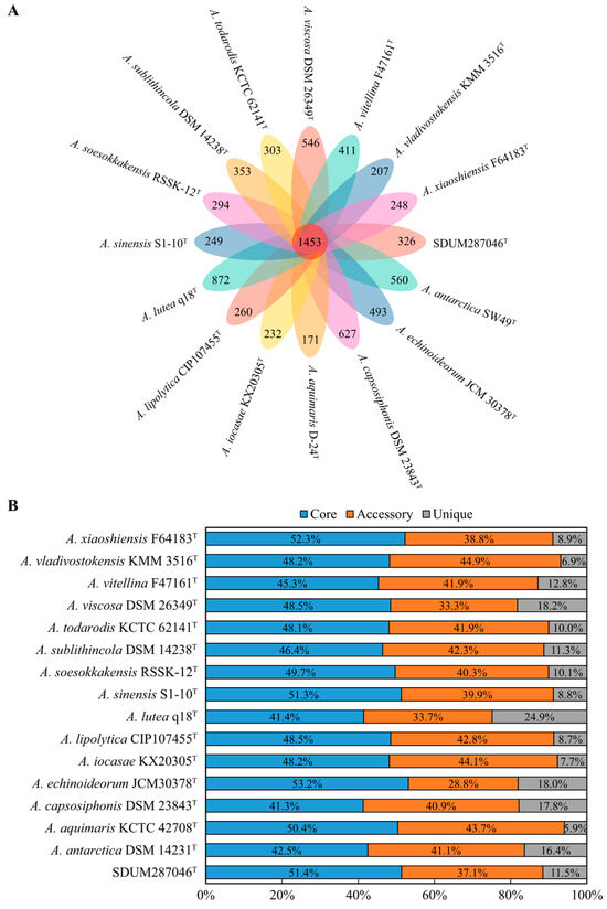 Pan-genome analysis of the genus Aequorivita (16 genomes). (A) Venn diagram displaying the numbers of core gene families and unique genes for each Aequorivita strain. (B) Percentage of core, accessory, and unique genes in each genome.