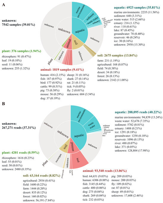 The global distribution of the genus Aequorivita was analyzed using the MAP database and pipeline, and the representative sequence was found in 19,335 samples from 3429 projects (details of the samples are summarized in Sheet S1). The results of biogeographic distribution analysis showed that members of the genus Aequorivita were widely distributed, including in aquatic environments, soil environments, animal environments, and plant environments. The Aequorivita bacteria were detected in 6923 aquatic samples (35.8%), but only 376 samples related plants (1.94%), and of the known aquatic environments, marine environments were the primary habitat (Figure 5A), which corresponded to the situation that most isolates were isolated from marine environments. The quantitative analysis of the database sequencing reads mapping to the representative OTU sequence showed the known habitat with the highest number of reads related to the genus Aequorivita was the marine environment (13.2%), followed by bird gut (9.0%) (Figure 5B).