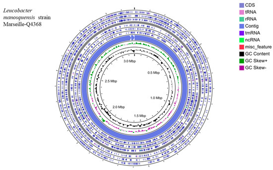 The genome size of strain Marseille-Q4368 was 3,184,602 bp long with a 67.34% G + C content. The genome assembly of this strain was achieved on three contigs (with 9.44× coverage). Of the 2976 predicted genes, 2870 were protein-coding genes and 59 were RNAs (3 16S rRNAs, 3 5S rRNAs, 3, 23 rRNAs, 47 tRNAs, and 3 ncRNAs) (Figure 3).