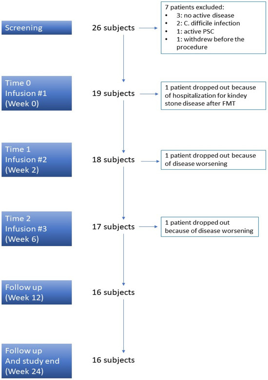 After a screening period lasting two weeks, the patients underwent FMT including repeated fecal infusions through three colonoscopies: at baseline (time 0), after 2 weeks (time 1), and after 6 weeks (time 2). Patients were followed up for safety and efficacy outcomes at week 12 via clinical and endoscopic assessment (sigmoidoscopy) and at week 24. These timepoints are consistent with those commonly used in clinical practice for biologic therapy, especially for Infliximab, that we hereby use as a comparison.