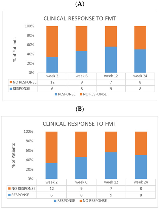 A clinical response was obtained in six subjects who completed the scheduled protocol of treatment at week 2, in eight at week 6, and in nine at week 12 (Figure 3A). Clinical remission in the FMT cohort was reached in four subjects at week 2, in five at week 6, and in five at week 12 (Figure 3B). Moreover, clinical response was maintained in eight of the patients from the FMT group until the last follow-up visit at week 24.