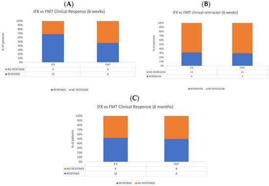 Comparison between FMT and Infliximab populations. (A) Clinical response rates at 6 weeks. (B) Clinical remission at 6 weeks. (C) Clinical response 6 months after the treatment.