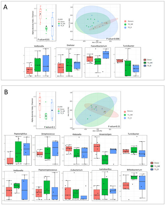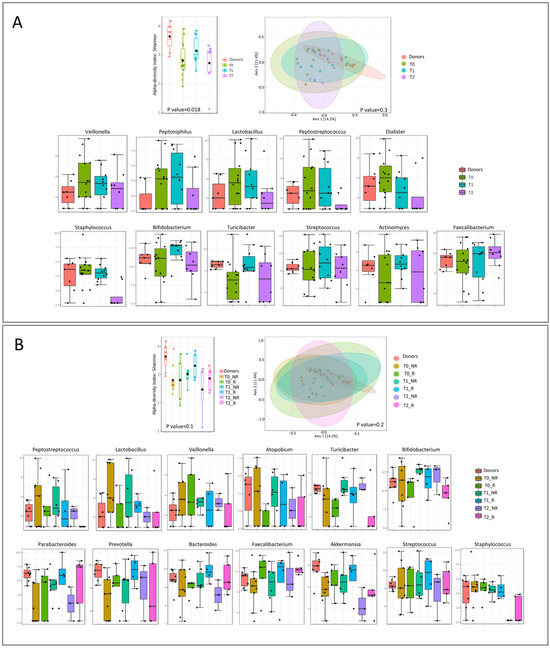 Microbial diversity and taxonomical analysis at T0, T1, and T2: (A) overall and (B) divided according to responder and non-responder.