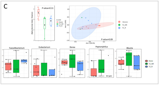 At T2, Faecalibacterium was lower in non-responders than in the other two groups. Dorea, Peptoniphilus, and Blautia had the opposite trend, being higher in non-responders compared with donors and responders. Eubacterium decreased in both groups of patients (Figure 6C).