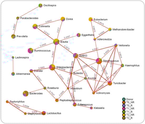 Network analysis was performed to reveal relationships between FMT-induced changes in human gut microbiota in responder and non-responder conditions (Figure 7).