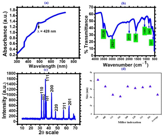Nodularia haraviana mediated silver oxide nanoparticles. (a) UV-visible spectrum. (b) FTIR spectrum. (c) XRD analysis. (d) Size calculation via Scherer’s equation.