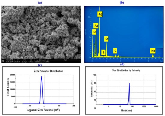 Characterization of phyco-synthesized AgNPs. (a) SEM image. (b) Elemental composition of AgNPs using EDX. (c) ZP measurements. (d) Particle size distribution.