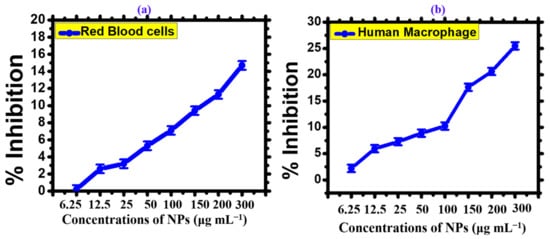 To confirm the biocompatibility of the synthesized AgNPs, human macrophages (HMs) were also utilized in this study. To initiate the experiment, the HMs were seeded into a 96-well plate and cultured in RPMI medium for 24 h to ensure cell attachment. The cells were then exposed to varying concentrations of silver oxide NPs ranging from 6.25 μg mL−1 to 300 μg mL−1. A dose-dependent response of the HMs to the AgNPs was observed, with the cells being inhibited by 25.48% at the highest concentration of 300 μg mL−1, suggesting the biocompatibility of the AgNPs []. Studies have shown that macrophages have inherent mechanisms to inhibit the detrimental effects of reactive oxygen species (ROS) generated from external sources. Lower levels of ROS production do not exhibit toxicity to macrophages or red blood cells as long as the concentration remains below a certain threshold []. It has been reported that an increase in the concentration of ROS can lead to toxicity in RBCs and macrophages []. The calculated IC50 value of the AgNPs was determined to be >395 μg mL−1, further supporting the biocompatibility of the synthesized AgNPs. Figure 6b displays the results of the biocompatibility assay performed on the AgNPs.