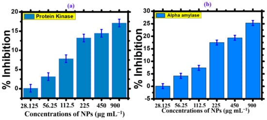 Enzyme inhibition activity of Nodularia haraviana-mediated AgNPs. (a) Protein kinase inhibition. (b) Alpha-amylase inhibition.