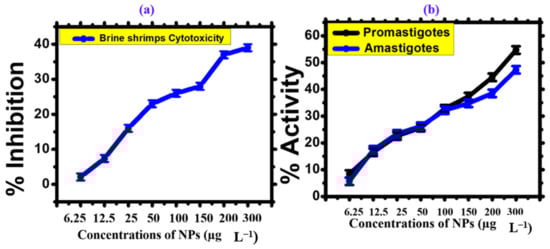 Leishmaniasis, caused by protozoan parasites of the genus Leishmania, is a widespread parasitic disease found in more than 100 countries globally []. The existing drugs used to treat this chronic disease often exhibit limited effectiveness, high costs, and potential toxicity. Despite the formulation of antimonials as potential therapeutic agents for leishmaniasis, the parasites have developed resistance to these drugs. As a result, scientists are looking for other medications to treat leishmaniasis. To assess the anti-leishmanial capability of the AgNPs, we exposed leishmanial promastigotes and amastigotes to a range of dosages (6.25–300 μg mL−1) for 72 h. Table 3 and Figure 9 shows that AgNPs had promising potential, with IC50 values of 18.71 μg mL−1 for promastigotes and 38.6 μg mL−1 for amastigotes []. Additionally, it was discovered that the promastigotes were more vulnerable than the amastigotes. These NPs may be employed in targeted drug delivery to treat leishmanial parasites, according to the reduced IC50 values. We believe that our work is the first to document the antileishmanial efficacy of phyco-synthesized AgNPs employing Nodularia haraviana. The same result was reported in some previous studies [,].