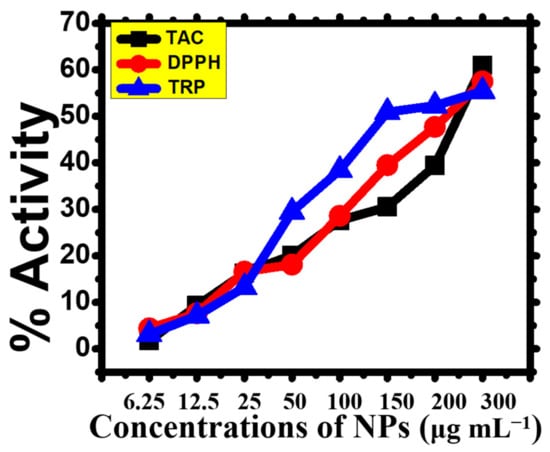 The antioxidant capacity of AgNPs was investigated using the spectrophotometric method [,]. The solution was made by mixing 25 mL of methanol with 2.4 mg of the free radical 2,2-diphenyl-1-picrylhydrazyl (DPPH). The AgNPs were treated at various concentrations (300 to 6.25 μg mL−1). In this experiment, ascorbic acid was the positive control, and DMSO was the negative control. A total volume of 200 µL comprising 20 µL of AgNPs and 180 µL of the reagent solution was utilized for making the reaction mixture. Then, these mixes were kept in complete darkness for 2 h. The spectrophotometer was used to measure the absorbance of the sample at 517 nm wavelength []. The total antioxidant capacity (TAC) was measured using the phosphomolybdenum method []. Results were represented as micrograms of ascorbic acid equivalents per milligram of the material examined. The sample absorbance was measured at 695 nm wavelength. DMSO was utilized as a negative control, while ascorbic acid was a positive control. The total reducing power (TRP) was measured using the potassium ferricyanide technique []. The positive control was ascorbic acid, while the negative control was DMSO. The absorbance of the sample was measured at a wavelength of 630 nm, and milligrams of ascorbic acid equivalents were used to assess the TRP.