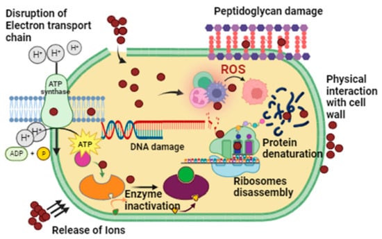 Using the agar disc diffusion method, the antibacterial activity of AgNPs was examined against harmful bacteria such as Staphylococcus aureus, Klebsiella pneumoniae, Pseudomonas aeruginosa, and coagulase-negative Staphylococcus [,,]. After being incubated in nutrient broth for 18 h at 37 °C, bacterial cultures were transferred to the nutrient agar medium, and wells were made using a cork borer. Then, each well received 50 µL of synthetic silver nanoparticles, and the plates underwent an 18 h incubation period at 37 °C. To investigate the antibacterial impact of the AgNPs, the clear zone of inhibition around each well was measured and computed []. The food poisoning method assessed AgNPs’ antifungal efficacy []. On PDA medium, preserved fungal strains were cultivated for 72 h at 26.1 °C. Silver oxide nanoparticles were added to potato dextrose agar medium in various quantities, from 50 to 200 μg mL−1. A 4 mm diameter fungal inoculum disc was gently put into the center of each PDA plate using a cork borer. PDA plates without nanoparticles were utilized as positive controls to compare the outcomes. The diagrammatic representations of AgNPs are shown in Figure 2.