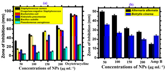 The disc-diffusion method (Figure 11), was used to evaluate the antibacterial activity of AgNPs at concentrations ranging from 50 to 200 μg mL−1 against Bacillus subtilis, Pseudomonas aeruginosa, Escherichia coli, Coagulase-negative Staphylococcus, Staphylococcus aureus, and Klebsiella pneumonia (Figure 12a and Table 5). Most bacterial strains were found to be susceptible to AgNPs, with coagulase-negative Staphylococcus and Staphylococcus aureus being the most susceptible strains (MIC: 50 μg mL−1), and Bacillus subtilis being the least susceptible strain (MIC: 150 μg mL−1). The positive control used was Oxytetracycline (10 μg). Not a single concentration of AgNPs was more effective than the positive control. Overall, AgNPs showed potential bactericidal activity against different bacterial strains due to the adsorbed functional groups on the surface of the nanoparticles, resulting in a dose-dependent effect. Previous results have shown that the antibacterial potential of AgNPs is due to ROS generation, membrane damage, and surface defects in the symmetry of NPs (Figure 11) []. Moreover, the bioactive functional moieties from Nodularia haraviana extracts that resulted in capped AgNPs played an essential role in antibacterial activity.