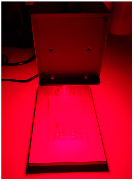 Suspensions of each Candida inoculum (~107 cells per mL) were divided into eight groups, four in the dark and four in the light. An aliquot of 100 μL was used for the dark control (DC), dark with MB (DM), dark with KI (DK), and dark with MB plus KI (DMK) from each sample. Another aliquot of 100 μL was used for the light control (LC), light with MB (LM), light with KI (LK), and light with MB plus KI (LMK) from each sample. These aliquots were transferred to a 96-well flat-bottomed plate (Corning Incorporated, Kennebunk, ME, USA) and illuminated from the top of the plates at room temperature using the aforementioned light device (Figure 1). At the completion of illumination (or dark incubation), aliquots (10 μL) were taken from each well to determine colony forming units (CFU). The contents of the wells were mixed thoroughly before sampling, as Candida inoculum can settle at the bottom. The aliquots were serially diluted 10-fold in PBS to give dilutions of 10−1 to 10−4 times in addition to the original concentration. Then, 10 μL aliquots of each dilution were streaked horizontally on square CHROMagar and SDA agar plates [34]. Plates were streaked in triplicate and incubated for 36–48 h at 35 °C in the dark to allow colony formation. Each experiment was performed at least three times.