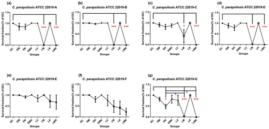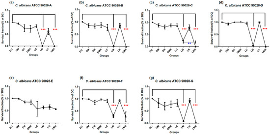 Survival fractions of aPDT schemes A–G (a–g) on C. parapsilosis ATCC 22019. Notes: DC, dark control; DM, dark with MB; DK, dark with KI; DMK, dark with MB plus KI; LC, light control; LM, light with MB; LK, light with KI; LMK, light with MB plus KI. All schemes had DM, DK, DMK, LC, LM, LK and LMK groups compared with their corresponding DC groups; LM and LMK groups showed significant differences except in schemes E and F (e,f); all DK groups showed no significant differences except in scheme G (g); in no scheme did the comparisons between LM and LMK groups show significance; in scheme G (g), the LM and LMK groups had lower survival fractions than the DK group; the red color of asterisks (*) in (a–g) represents significance when compared with the DC groups; the blue color of asterisks (*) in (g) represents significant groups compared with each other; *** represents p < 0.001; * represents p < 0.05.