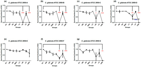Survival fractions of aPDT schemes A–G (a–g) on C. glabrata ATCC 2950. Notes: DC, dark control; DM, dark with MB; DK, dark with KI; DMK, dark with MB plus KI; LC, light control; LM, light with MB; LK, light with KI; LMK, light with MB plus KI. All schemes had DM, DK, DMK, LC, LM, LK and LMK groups compared with their corresponding DC groups; LM and LMK groups showed significant differences except in scheme E (e); Comparing LM and LMK groups with each other in each scheme, only scheme D (d) showed significance; the red color of asterisks (*) in (a–g) represents significance when compared with the DC groups; the blue color of asterisks (*) in (d) represents significant groups compared with each other; *** represents p < 0.001; ** represents p < 0.01; * represents p < 0.05.