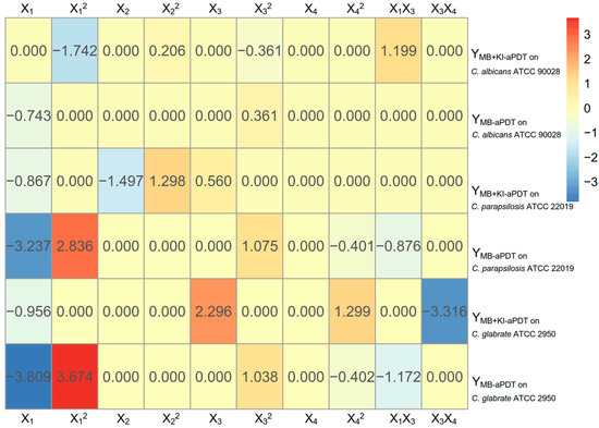 According to the heat map of regression coefficients (Figure 5), within the U7(74) uniform design range, the killing efficiency of MB + KI-aPDT on C. albicans ATCC 90028 was negatively associated with MB concentration (primarily) and light dose, while weakly positively associated with KI concentration. There were interactions between MB concentration and light dose, which were positively associated with aPDT killing efficiency on C. albicans. As for the killing efficiency of MB-aPDT, it was positively correlated with light dose but negatively correlated with MB concentration, with no interactions between the parameters. It is worth noting that neither MB + KI-aPDT nor MB-aPDT showed any relationship between their killing efficiency on C. albicans and the incubation time of MB.