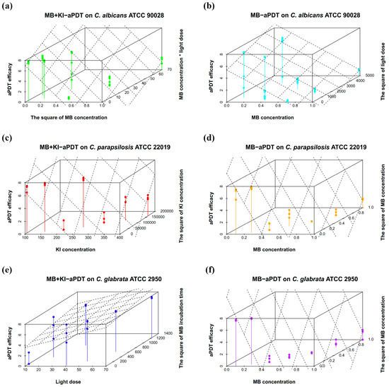 Regression 3D scatter plots of MB + KI-aPDT and MB-aPDT efficacy with associated parameters. Notes: Length, width, and height in each 3D scatter plot represent the x, y, and z-axes, respectively, with each z-axis representing aPDT efficacy. Planes represent the predicted values of aPDT efficacy, while dots represent the actual values. MB concentration * light dose on the y-axis in plot (a) represents interactions between MB concentration and light dose. (a,c,e) are regression 3D scatter plots of MB + KI-aPDT on C. albicans ATCC 90028 (a), C. parapsilosis ATCC 22019 (c), and C. glabrata ATCC 2950 (e), while (b,d,f) are regression 3D scatter plots of MB-aPDT on C. albicans ATCC 90028 (b), C. parapsilosis ATCC 22019 (d), and C. glabrata ATCC 2950 (f).