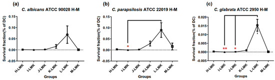 Survival fractions of aPDT schemes H–M on three Candida strains. Notes: LMK, light with MB plus KI; survival fractions of H to M schemes’ LMK groups were compared with each other in each Candida strain (a–c). (a) Survival fractions of H to M schemes on C. albicans ATCC 90028; LMK groups did not exhibit a significant difference in C. albicans ATCC 90028; (b) Survival fractions of H to M schemes on C. parapsilosis ATCC 22019; the LMK group in scheme L showed a significant difference from that in scheme I in C. parapsilosis ATCC 22019; (c) Survival fractions of H to M schemes on C. glabrata ATCC 2950; the LMK groups of schemes I and J exhibited significant differences from that of scheme L in C. glabrata ATCC 2950; ** represents p < 0.01; * represents p < 0.05.
