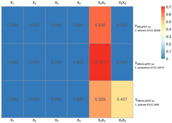 It can be seen in Table 7 and Figure 5 that, despite all three Candida species having a negative association between MB + KI-aPDT killing efficiency and MB concentration, they have different combinations of optimal aPDT parameters from each other. The interactions between MB concentration and light dose on C. albicans ATCC 90028, and the interactions between light dose and MB’s incubation time on C. glabrata ATCC 2950, play contrary roles in MB + KI-aPDT killing effectiveness.