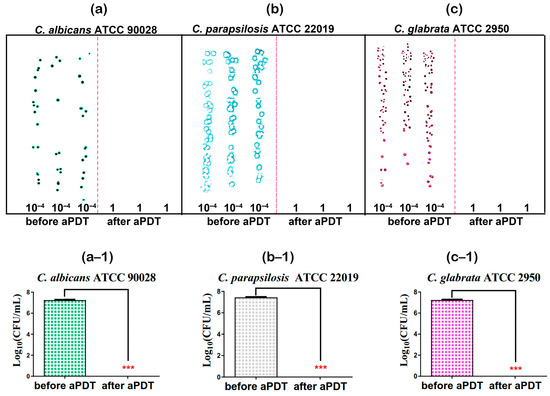 MB + KI-aPDT killing effectiveness of optimal aPDT parameters on three Candida strains. Notes: (a–c) are scanned images of viable Candida culture colonies on square CHROMagar before and after one session of MB + KI-aPDT killing; Candida cells were all eradicated after one session of MB + KI-aPDT. C. albicans ATCC 90028 (a) and C. glabtata ATCC 2950 (c), respectively, exhibited dark green and purple culture colonies on CHROMagar, whereas C. parapsilosis ATCC 22019 (b) showed white culture colonies which were not clearly visible in the scanned image; thus, a blue background color was added to highlight the culture colonies. A value of 10−4 means the aliquots were serially diluted to 10−4 times the original concentration, while 1 means no dilution from the original concentration. (a−1)–(c−1) are the statistical results of Log10 (CFU/mL) before and after one session of MB + KI-aPDT killing on three Candida strains, which was repeated at least three times; *** represents comparisons of Log10(CFU/mL) before and after aPDT, all p < 0.001.
