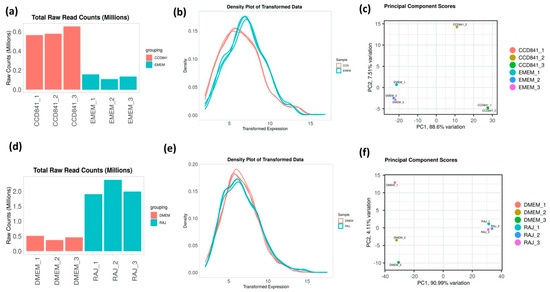 Diagnostic plots depicting the sequencing depth bias in each treatment. (a,d) Total raw read counts per library. (b,e) Density plot of regularized log-transformed total read counts. (c,f) Differentiation between treated and control samples is readily apparent in the principal component analysis (PCA), which accounts for 88.6 and 91.26% of the observed variation in CDD CoN 841 and RAJ-infected E. coli O157:H7, respectively, when compared to untreated samples. Total read counts are significantly different among sample groups (p = 1.16 × 10−4) based on ANOVA.